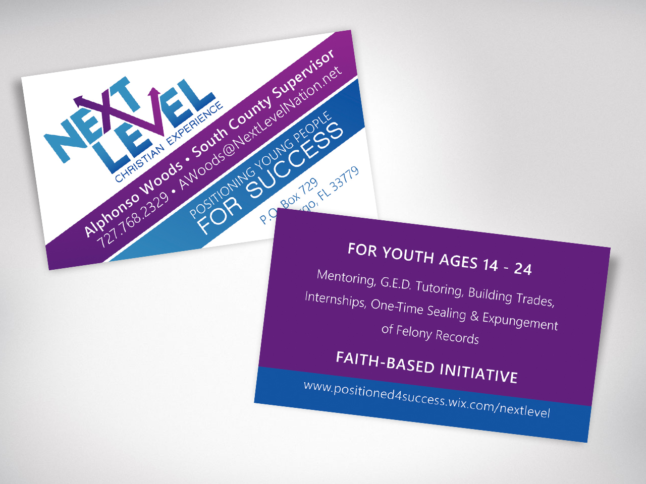 Logo and business card design for Next Level Christian Experience a mentorship program for at-risk youth and young adults ages 14 – 24 in Clearwater, FL